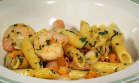 15. Выложить готовый зелёный рис на тарелку, посыпать тёртым сыром, в центр – кальмар в сливочном соусе.