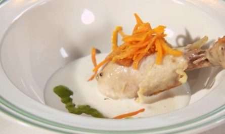 11. Перекладываем кускус в глубокую тарелку, добавляем ломтики курицы-гриль, дольки апельсина, проливаем соком апельсина, добавляем оливоковое масло, кольца красного лука, сверху посыпаем цедрой апельсина и измельчёнными фисташками.