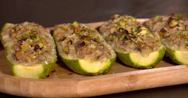 8. Выложите сюда же кабачки и наполните их начинкой.