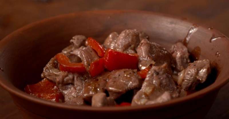22. Затем добавить подготовленные перец, перец чили. Прямо в мясо положить немного наршараба, посолить, поперчить.