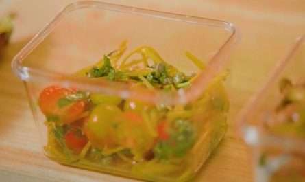 13. Нарезаем на кусочки болгарский перец желтый и красный, соединяем с салатом, добавляем соль, сахар.
